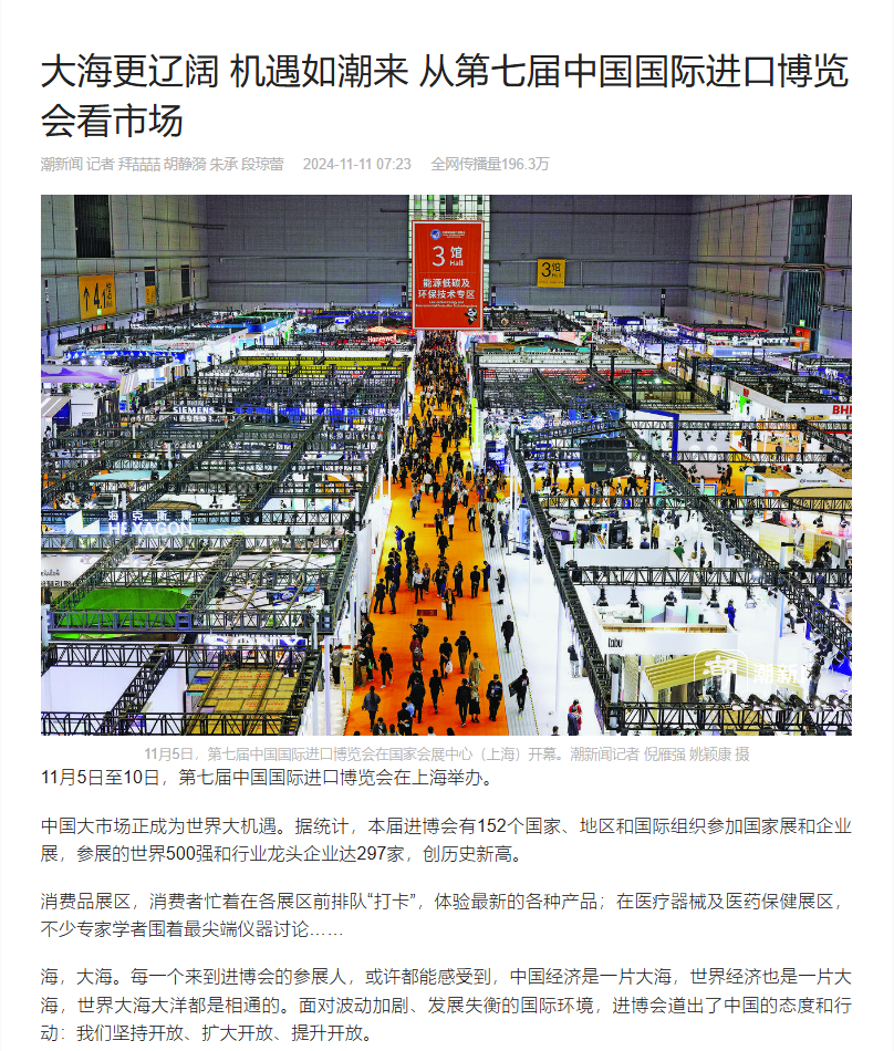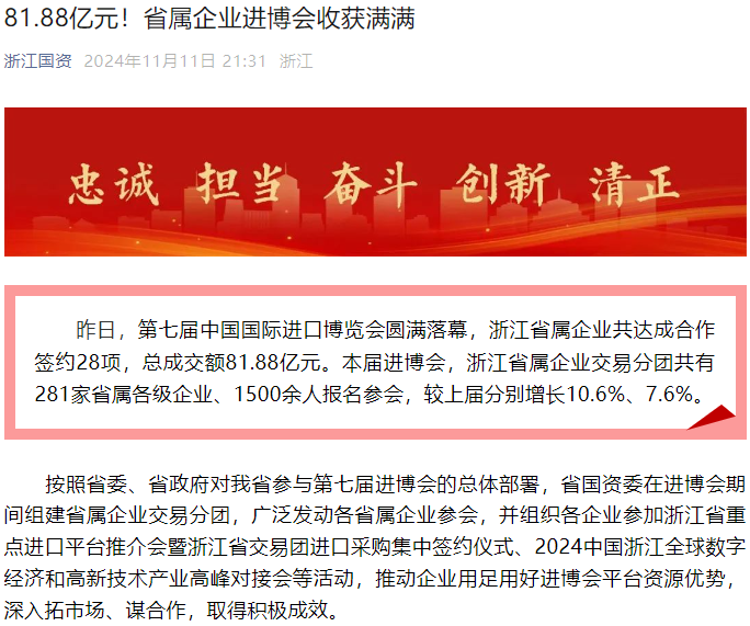 11月5日至10日,第七届中国国际进口博览会(进博会)在上海国家会展中心举办。本届进博会以“新时代,共享未来”为主题,吸引了来自152个国家、地区和国际组织的参展商。星空网球游戏官网组织旗下6家企业的30余名代表积极参会。浙江日报、潮新闻、浙江卫视、浙江国资等多家媒体对星空网球游戏官网参会进行了报道。