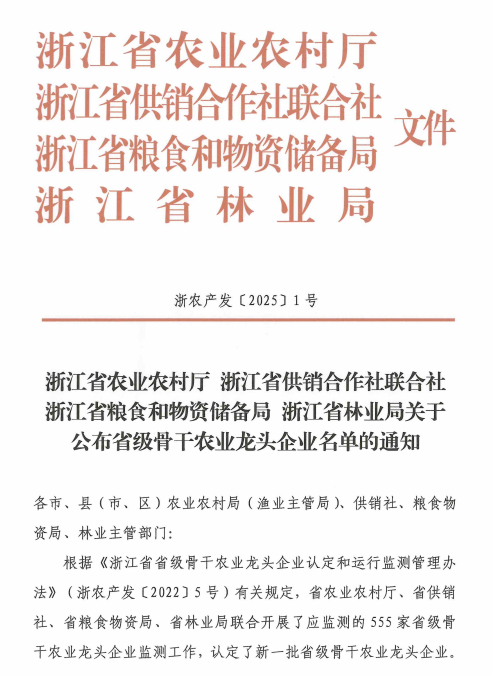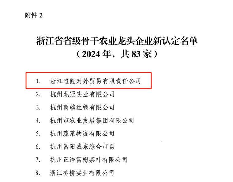1月14日,省农业农村厅、省供销社、省粮食物资局、省林业局四部门联合印发通知,新认定浙江惠隆对外贸易有限责任公司等83家企业为省级骨干农业龙头企业。