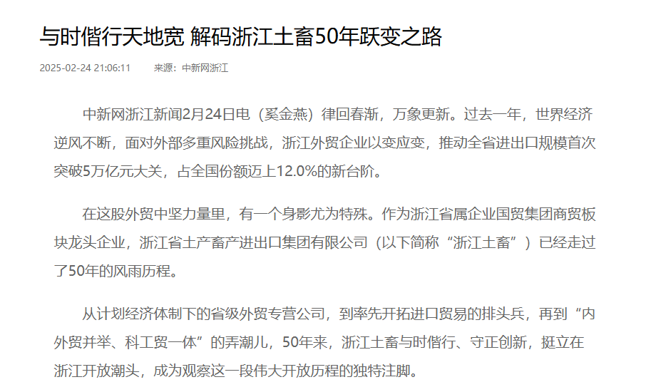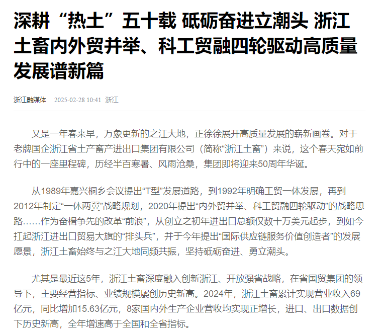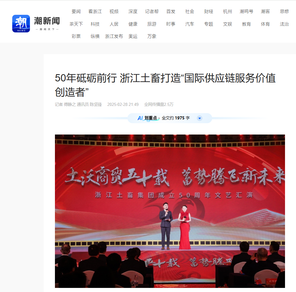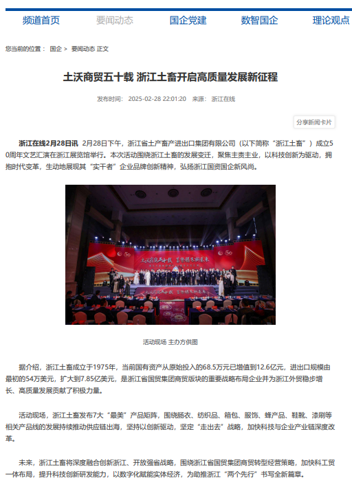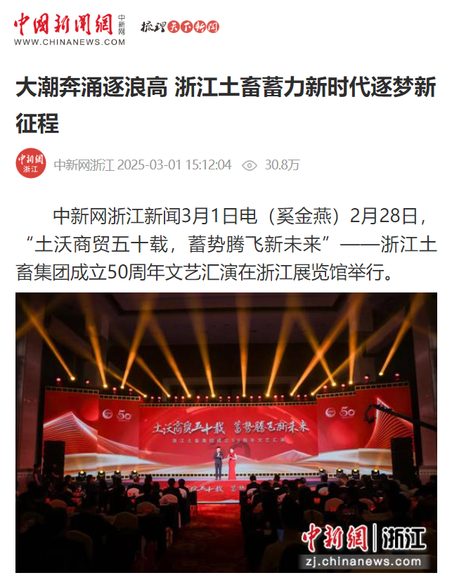 2月28日,星空彩票软件线上大全(星空网球游戏官网集团)在浙江展览馆举行公司成立五十周年文艺汇演。本次文艺汇演以“土沃商贸五十载,蓄势腾飞新未来”为主题,以“沃土育初心”、“跨越五十载”和“蓄力新时代”为三个篇章,邀请了中国食品土畜进出口商会、中国纺织品进出口商会、浙江省商务厅、浙江省农业农村厅、杭州市拱墅区人民政府、浙江省国贸集团、天水街道领导及公司职工代表共计百余人参加活动。浙江日报、中新社浙江分社、潮新闻、人民号、浙江国资、浙江融媒体和今日头条等媒体报道、转发,全网总阅读量逾百万。