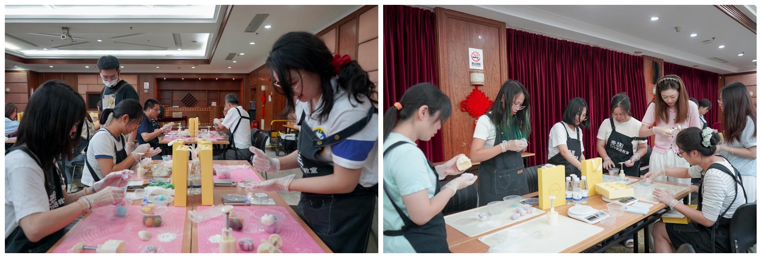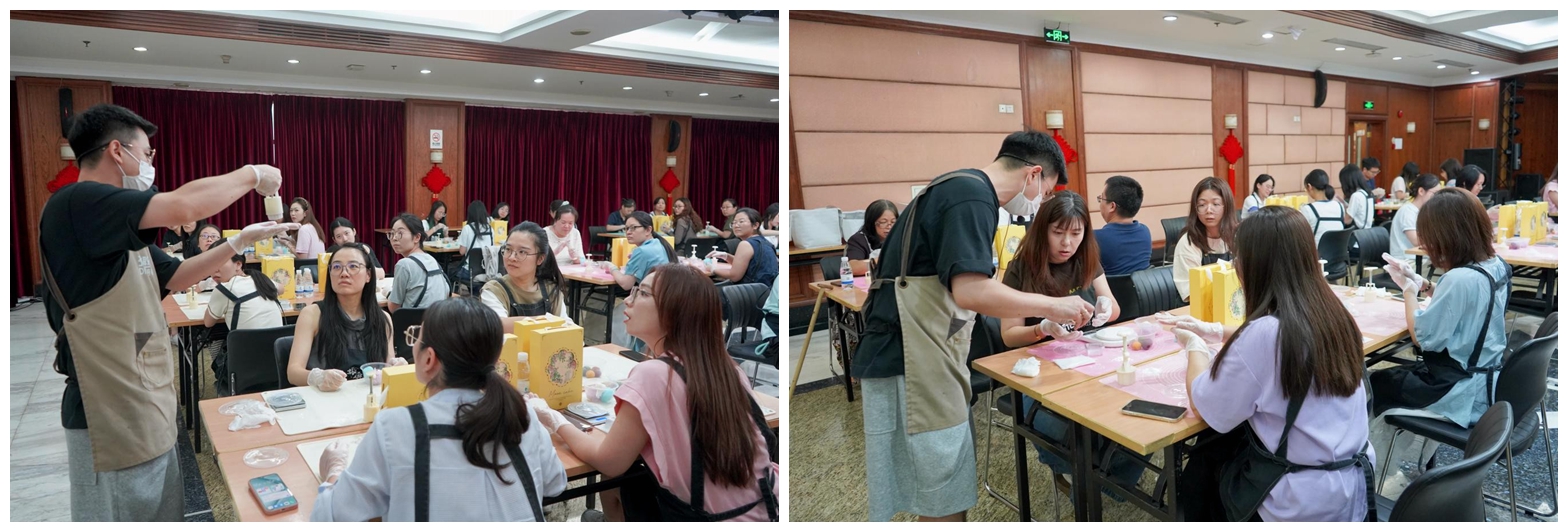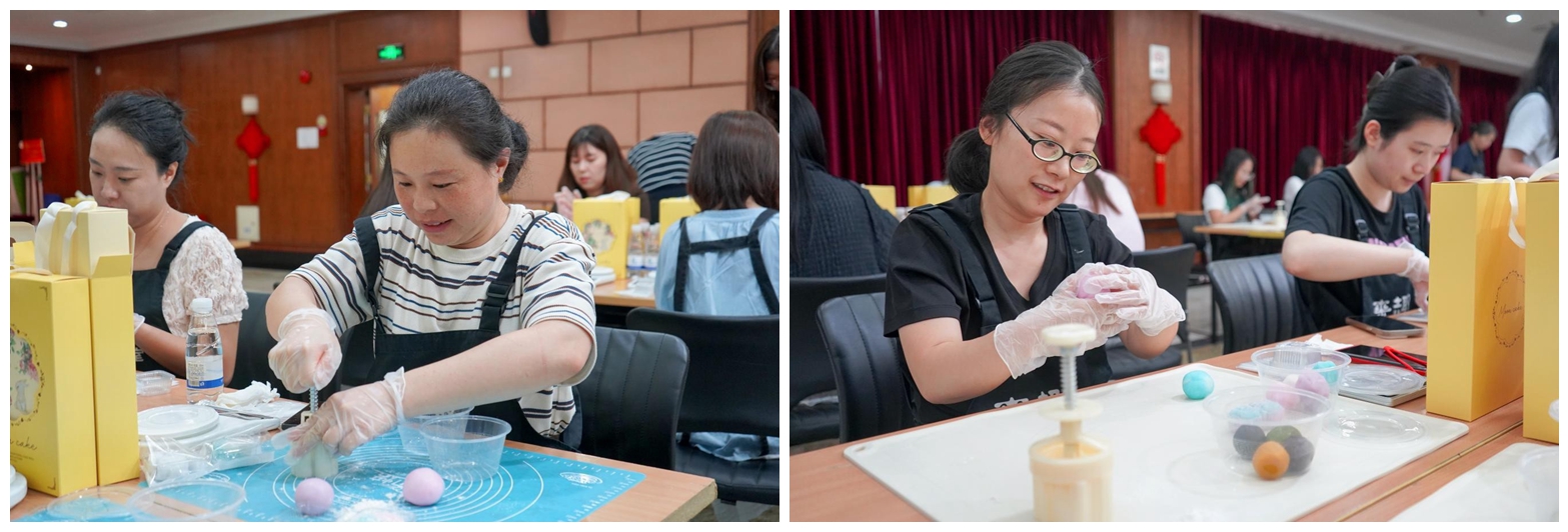 活动现场,清甜的馅料香与欢声笑语交织萦绕,员工们纷纷动手体验冰皮月饼的制作过程。从揉皮、包馅到压模成型,大家专注投入,巧手为媒,共织一场穿越古今的中秋绮梦。