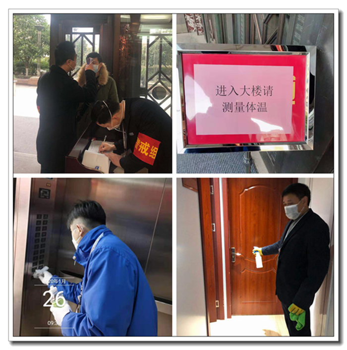 物业服务中心、华祥保洁在办公室统一指挥下,全力做好大楼的防疫保障工作。门岗员工严格执行来访登记制度,对全体进入大楼人员开展体温检测、询问湖武汉、温州、台州等疫情区接触史情况,并做好相关信息登记备查;落实专人每天对一楼大堂、前台、电梯厅、公共卫生间、监控室等公共部位及重要值班场所,用消毒液每天进行环境消毒,并适当保持一定数量和时间通风工作,确保大楼环境安全。