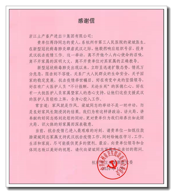 办公室蒋琤同志舍小家顾大家,鼓励丈夫、杭州市第三人民医院的梁斌医生积极响应组织号召,赶赴武汉投身到抗击疫情的战斗中去,得到了杭州市卫健委的高度赞扬。