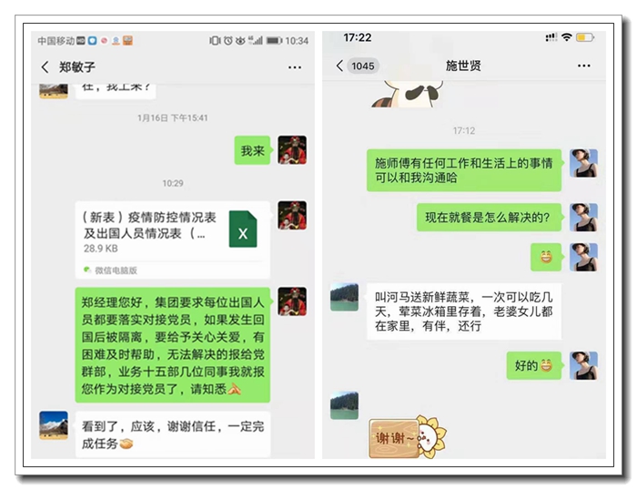 在疫情防控升级的第一时间,各支部就积极响应党委号召,组织党员关心关爱疫情严重地区的员工健康和生活情况。目前公司43位疫情严重地区员工、40位国外返回人员以及20位准备出国人员全部落实了对接党员,确保每一位自我隔离的员工在遇到困难时,组织能够第一时间发现并给予帮助。