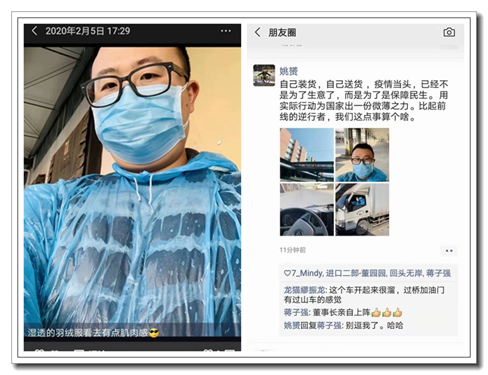 为了确保与公司长期合作的大型超市冷冻肉类货源供应充足,维护市场肉类产品的价格稳定,省土畜进口二部副经理姚赟面对冷库基地限时开放、外包运输受限无法上路的不利局面,与同事承担起了紧急配送的民生保障任务。整整两车共计10吨冻肉的装卸配送后,汗水、热气让姚赟的外套和防护雨披黏在了一起,轻猫淡写的一句“湿透的羽绒服看去有点肌肉感!”背后隐含的是土畜人为合作客户和消费者极限服务的责任心。