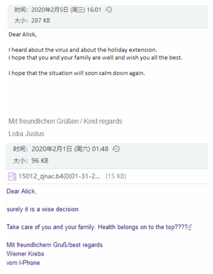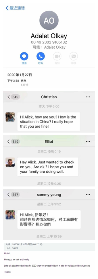 作为业务一线的业务部门,业务六部的客户分布在美国,德国,意大利,荷兰等国家,在得知疫情的第一时间,各种问候的邮件就雪花片一般地飞来,因为假期在家,业务员没有第一时间看到邮件,客人就通过微信,甚至直接电话前来询问是否平安。
