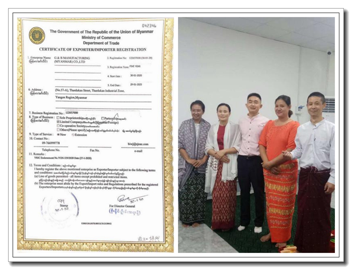 近年来,随着国家“一带一路”倡议的深入实施,中缅双边投资合作持续稳步发展,为传统外贸行业实施“走出去”战略创造了良好的政策环境。在此背景下,省土畜积极响应国家号召,紧紧围绕国贸集团“全面高质量建设一流企业”的战略目标,锐意进取、奋力开拓,不断加快海外基地的建设步伐,2016年公司设立缅甸办事处,踏出了缅甸服装加工业务的第一步。2019年下半年,公司决定正式启动海外生产基地建设项目,惠元缅甸制衣厂筹建组在短短几个月时间内就先后完成了申报审批、租建厂房、招聘员工、采购设备等诸多筹建工作。2020年1月惠元缅甸制衣厂成功取得了缅甸商务部贸易司颁发的进出口登记证书,2月9日正式进入投产试运营阶段。