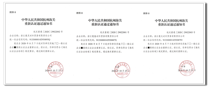 日前,公司下属浙江惠元对外贸易有限责任公司、浙江惠灵对外贸易有限责任公司、浙江惠隆对外贸易有限责任公司收到了杭州海关签发的《重新认证通过通知书》,成为今年杭州关区首批通过AEO高级认证重新认证的企业。
