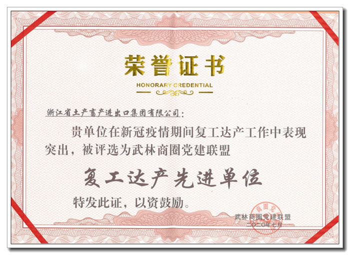 7月15日晚,杭州市武林商圈党建联盟举行2020年年会,来自联盟各成员单位的300余名党员参加活动。大会表彰了在疫情防控、复工达产、党建共建方面的模范单位以及在疫情防控工作中表现突出的先进党员,省土畜被授予“复工达产先进单位”称号。浙江省商务厅党组书记、厅长,联盟轮值主席盛秋平,杭州市下城区委书记刘颖出席会议,并为获得表彰的单位和个人颁发证书奖杯。