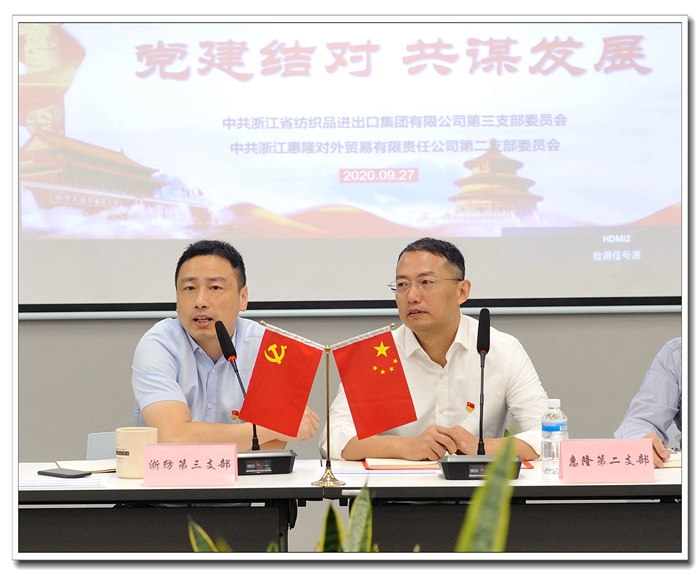 省纺集团第三党支部书记、总经理助理胡疆同志就党建共建工作谈了下自身的感悟,并介绍了所分管的子公司亿德公司从做外贸中间商到与知名零售商合作再至“三元合作”商业模式的艰苦奋斗历程,以及亿德公司以环保为切入点,迎合新时代青年的需求导向,拓展环保服饰内外贸结合的业务新方向。施董随后补充介绍了省纺集团在尼日利亚海外仓的规划布局。
