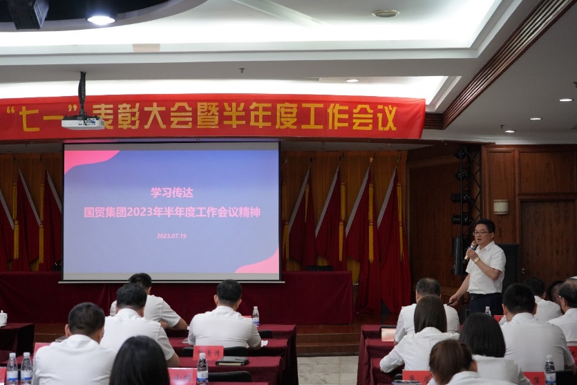 公司党委副书记、总经理杨跃胜传达了省国贸集团半年度工作会议的精神,并作《抢订单 稳外贸 优结构 全力以赴落实全年目标任务》报告,分析上半年经营情况,对下半年工作进行了部署。上半年,公司按照集团部署,以积极的态势抓住机遇、争取订单,确保进出口额逐步增长,经营业绩稳步提升。他要求全体职工要在加强党的建设、稳定进出口主业、推动双循环拓进口内贸、深化科工贸融四轮驱动、项目投资改革创新、管理提升风险控制六方面,打好下半年攻坚战,努力实现全年目标。