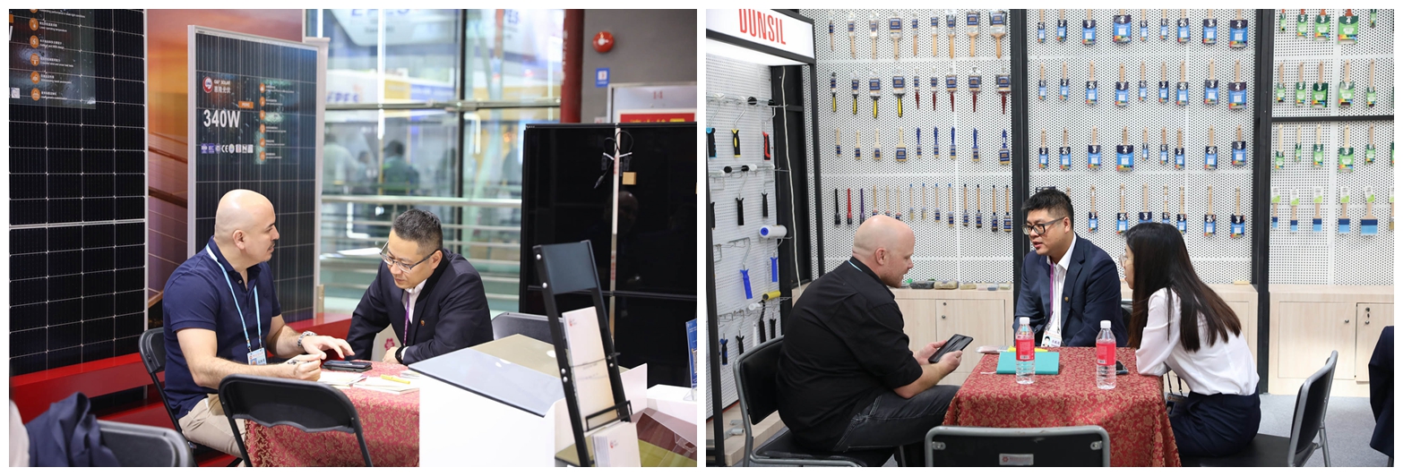 10月15日至20日第一期广交会,在公司五金工具、汽配、新能源等9个摊位上,漆刷团队带来了全新设计的人体工程学手柄油漆刷,汽配团队展出轻巧、耐用的新一代车顶架和自行车架产品,新能源团队陈列的光伏组件效率高达23.5%,吸引了众多海外客商来公司展位洽谈、了解产品。